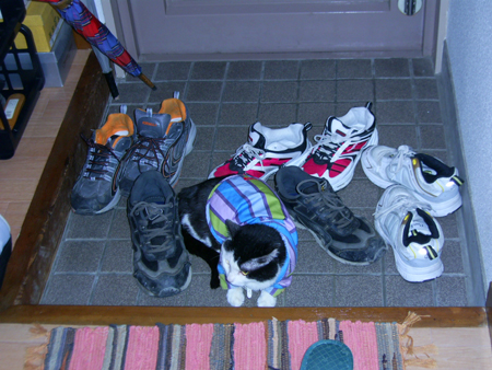 やからからしらんけど、タイルの玄関に寝転びはった